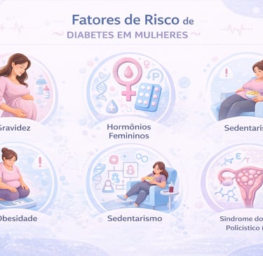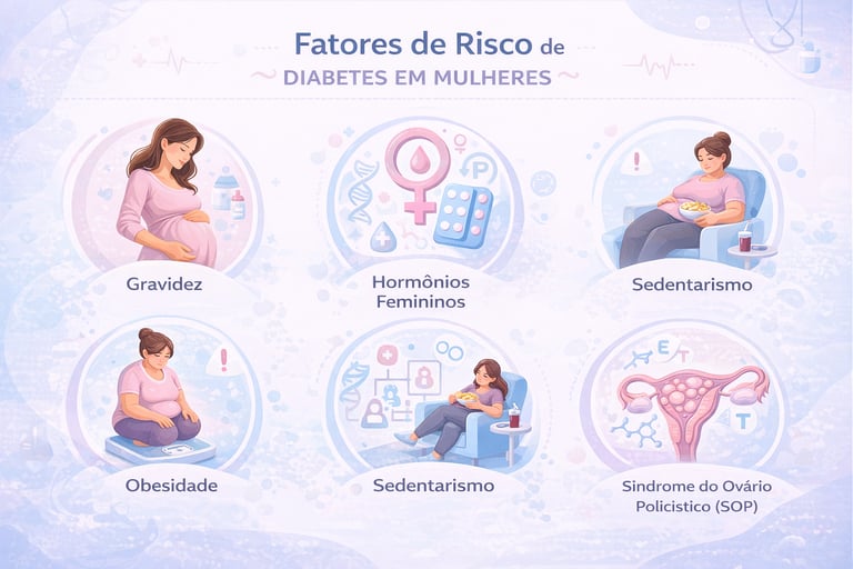 Fatores como gravidez, alterações hormonais, síndrome do ovário policístico e menopausa influenciam diretamente o metabolismo da glicose e o risco de complicações.